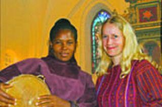 Med sig har Betty og Peter dels kirkens to kor, pigekoret og gadekoret, dels en lille håndfuld musikalske venner. Fra Tanzania kommer Jenitha Abela Kameli og spiller trommer til både danske og afrikanske salmer. På billedet ses Jenitha sammen med Betty.