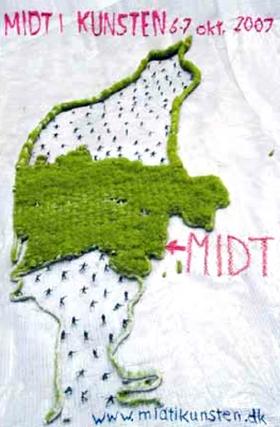 Region Midtjylland har bedt billedkunstner Marianne Jørgensen fra Århus om at skabe en plakat til »Midt i kunsten«. Marianne arbejder ofte med materialerne græs og broderi i sine værker, og det har hun også valgt at gøre til plakaten for »Midt i kunsten«.