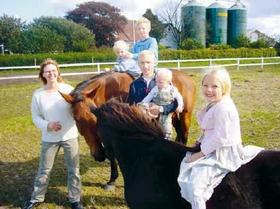 Her ses næsten hele familien på Pilegaard nord for Grenaa, der inviterer til Åben gård på søndag. De små er Daniel på 10, der sidder på hesten bagerst, Julia på 6 år tv., Villads på 3 år foran på hesten, og Viktor på 1 år i armene på Thomas.