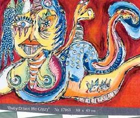 Niels Jensen, der er født i 1965, er en af de nye spændende kunstnere, der gør sig stærkt gældende i den moderne danske samtidskunst. Hans værker tager tematisk og stilmæssigt afsæt i Cobra-stilen. Et væld af små fugle- og menneskelignende fabelvæsener vælter frem i værkerne, der er holdt i røde, gule og blå primærfarver. De farvestrålende lærreder beretter om eksistensielle forhold, der til alle tider har været de dominerende kræfter i tilværelsen: parforhold, konkurrence, mobning, erotik, sorg, glæde og meget andet. Således bærer nærværende Niels Jensen-billede titlen »Baby Drives Me Crazy« (80 x 60 cm.). Niels Jensens spontant fabulerende malerier skaber en umiddelbar glæde over farvespillet og livligheden i lærrederne hos beskueren. Men ved et nærmere eftersyn ser man, at kunstnerens farvevalg er stærkt følelsesbærende, og at farverne sammen med figurernes attituder afslører almene menneskelige relationer.