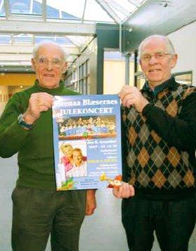 Det er første gang, der er helt udsolgt til én af Grenaa Blæsernes julekoncerter, og det hænger nok sammen med, at man i år har lokket selveste Hr. og Fru Danmark - Keld og Hilda Heick - til Grenaa. Den kendte duo skal både lave deres egen afdeling, samt musicere sammen med Grenaa Blæserne, som på søndag stiller op i en 33-mands udgave. Programmet for eftermiddagen er selvsagt fyldt godt op med julens kendte sange og melodier, men der vil også blive spillet andre ting. Blandt andet vil Grenaa Blæserne diske op med Frank Sinatra-klassikeren »My Way«. Peter Præstholm dirigerer, mens Svend Larsen binder de forskellige numre sammen som konferencier. På billedet ses Aksel Frandsen og Henning Stoffer fra Grenaa Blæserne med plakaten til dette års julekoncert i Kulturhuset Pavillonen. Der er tilkaldt »forstærkning« via tre musikere fra et venskabsorkester i Horsens, ligesom enkelte lokale musikere også træder hjælpende til - så det kan lyde af noget!!