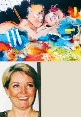 – Billederne indeholder et strejf af noget frækt og provokerende - en symbiose af noget gennemtænkt og noget destruktivt - uden dog at miste humoren. Jeg vil gerne formidle kærligheden og den umiddelbare glæde i mine billeder, siger Conni Østergaard. Nærværende maleri hedder »My Angel« (120 x 150 cm).