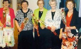 Der var traditionen tro fuldt hus til denne AJ-modeopvisning, hvor fem friske damer fra den lokale venneforening stillede sig til rådighed som mannequiner. På det ene billede ses de alle fem, mens man på det andet kun kan se en enkelt i skikkelse af Föbe Larsen. De fem er fra venstre: Kirsten, Herdis, Karena, Föbe og Irma.