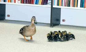 I forrige uge sendte man således et kuld på 13 af slagsen godt i vej (billedet), og et nyt kuld er lige på trapperne. Det forholder sig nemlig sådan, at flere vordende ande-mødre hvert år kaster deres kærlighed på Grenaa Bibliotek, idet et kuld ællinger skal ruges ud. Bibliotekets åbne atriumgård er i ande-kredse nemlig anset for at være særdeles velegnet til formålet, og hvert år er der således nogle stykker, der bruger atriumgården som »udrugnings-klinik«. Da atruimgården ikke har egen udgang, så er det ensbetydende med, at andemor og hendes nyudklækkede ællinger må en tur igennem selve biblioteket, før en genforening med naturens verden kan komme på tale. Denne trafik har bibliotekets personale efterhånden opbygget en vis rutine i, så man har en ret veldefineret slagplan klar, idet andemor og hendes ællinger er rede til at blive gelejdet ud af biblioteket via hovedindgangen. Men her slipper man dem ikke. Man følger efter, og stopper om nødvendigt trafikken på Åboulevarden, idet and og ællinger skal krydse den trafik-farlige vej. Herefter er der fri bane ned til den forjættede å. Det er Bent Kjeldsen fra Grenaa Egnsarkiv/Grenaa Bibliotek, der har sendt disse fine ande-fotos til Grenaa Bladet - og vi takker skyldigst.