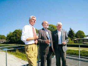 Direktør i Calum Ejendomsaktieselskab Henrik Calum (til venstre), Norddjurs' borgmester Torben Jensen (i midten) og Keld Overgaard Jensen, vicekommunaldirektør i Norddjurs Kommune nød udsigten og den friske brise på taget af den pavillon, Calum har stillet op i området. Højden på pavillon er den samme som på de kommende boliger, så oppefra fik man et godt indtryk af den udsigt, de kommende købere kan nyde.