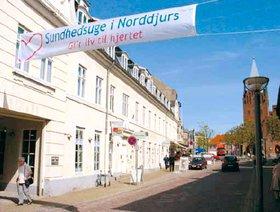 Sundhedsugen er også synlig i gadebilledet. Her ses et banner, der er hængt op ved Djurslands Museum i Grenaa Centrum.