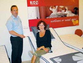 Ved at besvare fire hurtige fødselsdags-spørgsmål kunne man deltage i en konkurrencen, hvor præmien var et komplet elevations-sæt - det vil sige inkl topmadrasser - fra KOZ til en samlet værdi af 15.000 kroner. Anne Mette Roaldtsen var en af de konkurrence-deltagere, der svarede rigtigt på alle fire spørgsmål, og hendes bidrag var således med i puljen, da der skulle trækkes en vinder. Lykkens gudinde var åbenbart med hende, for hun er nu blevet en komplet elevationssæt fra KOZ rigere. På billede ses den glade vinder sammen med indehaveren af Bolighuset i Grenaa, Steen Petersen.