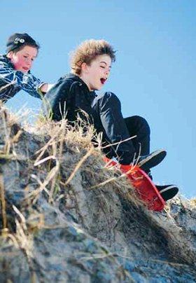 Der sker altid noget sjovt i juniorklubben i Grenaa. Hvem siger man ikke kan køre på bobslæde bare fordi der ikke er sne? En tur til stranden med juniorklubben klarer det problem. Foto: Mads Rasmussen.