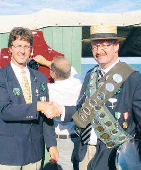 Kort efter, at kongeskuddet er faldet kl. 18.27, lykønskes Grenaas nye fuglekonge, Torben Kristensen (til højre), af formanden for fugleskydningsselskabet, Stig Bjerring.