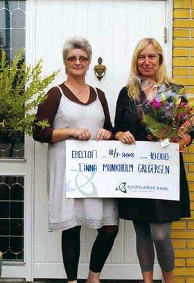 Den heldige vinder, Tinna Munkholm Gregersen (til højre), og rådgiver Birgit Nielsen fra Djurslands Bank i Ebeltoft.