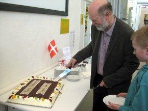 Borgmester Torben Jensen skar lagkagen for og uddelte kage til den mange fremmødte. Her fortrinsvist børn der i fremtiden nok skal få meget glæde af det tilbud Auning Bibliotek og Norddjurs Frivilliggruppe tilbyder til Norddjurs kommune børn og unge.