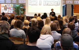 ”Vores elever bruger ikke altid sproget hensigtsmæssigt, sÃ¥ da jeg sÃ¥ kampagnen 'Gang i Sproget' pÃ¥ Facebook og tog sprogtesten, blev jeg sÃ¥ begejstret, sÃ¥ jeg besluttede at bestille det her foredrag for at give eleverne en sproglig vitaminindsprøjtning. Jeg tror, de har fÃ¥et rigtig meget ud af det i dag,” skønner elevernes dansklærer Gitte Bjørn.