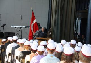 Ib-studenter til flaghejsning foran skolen. Her vil rektor sammen med eleverne traditionen tro hejse flaget.