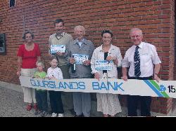 I sidste uge fik de tre vindere så overrakt deres gaver ved en lille seance hos Djurslands Bank Ryomgård. Fra venstre er det bankrådgiver Betina Christensen, Jens Emil Sanggaard, Nimtofte (5.000 kr.) m. børnene Simon og Johanne, Karl Larsen, Ryomgård (2.000 kr.) og Tina Aude Gudumlund (3.000 kr.) og bankrådgiver Bjarne Nygaard.