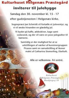 I Julestuen denne søndag ønsker man hinanden glædelig jul ! - Sognepræst Jan Schmidt vil læse et juleeventyr og der vil være godteposer m.m. til børnene. Der bydes på kaffe og kage samt sodavand. Det vil samtidigt være muligt at se Kulturhusets gamle skolestue og udstillingerne af malerguppen Picasso m.fl. samt ikoner malet af ikonmaler Cathariana Siemerling fra Ebeltoft.