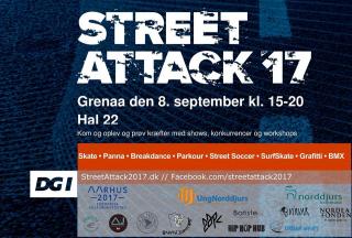 Streetattack 2017 og Urban præsenteres af DGI Østjylland og Syddjurs Kommune på vegne af StreetCultureCluster. Oplev Skate, SurfSkate, Parkour, Breakdance, Street Soccer, Panna. Street Attack er gadefolkefester med sport og streetkultur, som rammer regionen med 10 events. En kæmpe manifestation af regional streetkultur. Der laves workshops og shows, serveres streetfood og musik, graffiti, streetart og markedsstemning. En Street Karavane med udvalgte udøvere afvikler workshops og shows m.m. - Mød det seje hold, hæng ud, og vær med til en dag i streetkulturens tegn. Ved hver lokal event hooker Street Crewet op med lokale aktører og laver den fedeste event i fællesskab.