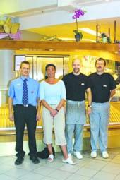 Fra venstre er det Jaco’s butikschef Klaus Beck, Tina og Jesper Kjærgaard fra Grenaa Bageri og den daglige leder af afdelingen, Charsten Lilleris.