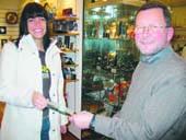 På dette billede overrækker indehaveren af Mouritsens Eftf. i Lillegade i Grenaa, Bent Bjerg Madsen, en »Cleopatra«-fingerring og et garanti-bevis fra smykkefirmaet Scrouples til Louise Rasmussen fra Grenaa.