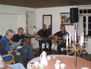 Spil Dansk med stearinlys og kaffe til. Fra venstre hjalp Sander Nielsen til på en meget lille tromme, Carsten Sørensen spillede bas, Bo Thallund piano og Helge Sørensen guitar.