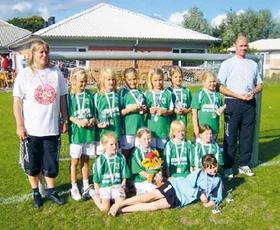 De spillede 4 kampe, hvilket resulterede i 3 vundne kampe - sejrene var på hhv. 4-1 , 4-0 og 2-0 - og et enkelt 0-1-nederlag. Det var ikke desto mindre nok til, at pigerne kunne kalde sig Jysk/Fynsk-mestre efter den fjerde og sidste kamp. På billedet ses pigerne med deres træner Leni Hansen og hjælpetræner Kaare Bønnerup. Og som man kan se er det taget på et tidspunkt, hvor pigerne har fået guldmedaljerne hængt om halsen.