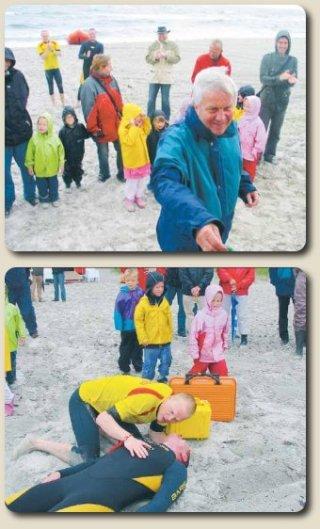 Lokale børnehavebørn var inviteret med til indvielsen af livreddertårnet ved Grenaa Strand, og de blev blandt andet vidne til en redningsdemonstration ved to af de lokale Tryg-livreddere.