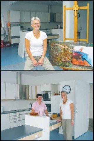 Afd.leder Inger Schmidt viser den store opholdsstue frem. Her er der også mulighed for mange aktiviteter, bl.a. oliemaling m.v. ---- Køkkenet er indrettet handicapvenligt, så beboerne kan hjælpe med madlavningen. Lotte Joensen, tv. og Inger Schmidt er glade for deres nye arbejdsplads.