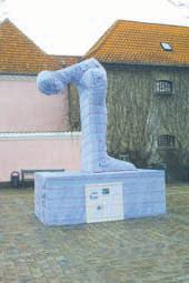 Skulpturen »Ofrende« af Peter Brandes, som Djurslands Bank forærede Grenaa i forbindelse med byens 550 års købstadsjubilæum i 1995, var blevet pakket ind i lilla velour!!