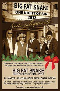 Hele Danmarks rockband fejrer 10-året for albummet "One Night of Sin" med en genopførelse af albummet på denne indendørs turné i foråret 2013. - Det er en intimkoncert med et begrænset antal pladser. - Under "One Night of Sin" koncerten vil du kunne opleve Big Fat Snake i et fantastisk live-setup, hvor Snake rundhåndet vil levere et miks af de allerbedste hits fra rocklegenderne Elvis Presley, Roy Orbison og naturligvis Big Fat Snake selv. - Desuden vil Big Fat Snake være flankeret af korpigerne Sweet Infiltrations, og spille de numre fra One Night Of Sin, som også blev spillet den fantastiske aften i Randers for 10 år siden og de vil sammen med publikum genskabe magien.