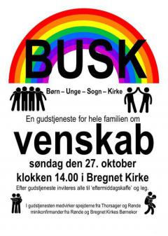 BUSK står for Børn-Unge-Sogn-Kirke og dagen fejres i mange kirker i hele Danmark. Hos Bregnet Kirke medvirker KFUM-spejderne fra Thorsager og Rønde. Præst er Anne Marie Poulsen Tolbod. Gudstjenesten er på 22. søndag efter Trinitatis.
