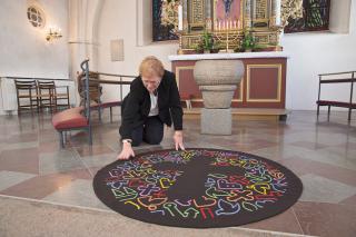 Helle Danvad med bryllupstæppet i Grenaa Kirkes kor.