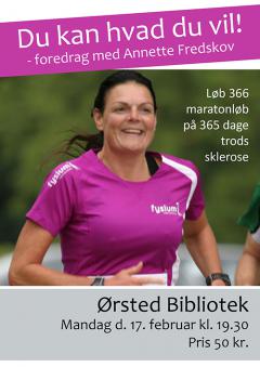 Annette Fredskov fik sklerose, men løb 366 maratonløb på ét år, hør hendes foredrag "Du kan hvad du vil" på Ørsted Bibliotek mandag d. 17/2 kl. 19.30