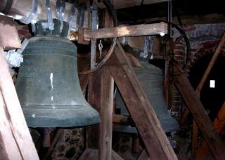 Klokker i det 27 klokker store klokkespil i Vejlby kirkes tårn.