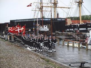 11.35 Tamburkorps og Faneborg marcherer til Fregatten Jylland.