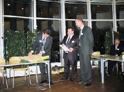 Prisen som »Årets virksomhed på Djursland« gik til Spectronic. Her får repræsentanter fra virksomheden overrakt prisen af formanden for Djurslands Erhvervsråds bestyrelse, Finn Brødløs.