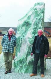 Hos Andersen & Maigaard i Følle ved Rønde står en stor, flammet, irgrøn klippesten og glimter i solen.