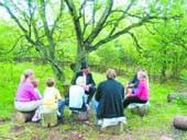 Just Mikkelsen fortalte indlevende om H.C. Andersens sangtekster og egne oplevelser her i landet og på rejse, hvor han mange gange kunne henføre hændelserne til ord som H.C. Andersen tidligere har skrevet. Dagens eventyr var "Lille Klaus og Store Klaus" – og der blev lyttet intenst under det grønne træ, midt i Feriebyens beplantninger.