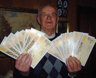 ”Nu bliver der købt lidt ekstra godt til julen”, sagde Niels Koustrup til bingoværten Poul Elo Bach da han overrakte ham 20 gavekort på hver 100 kr.